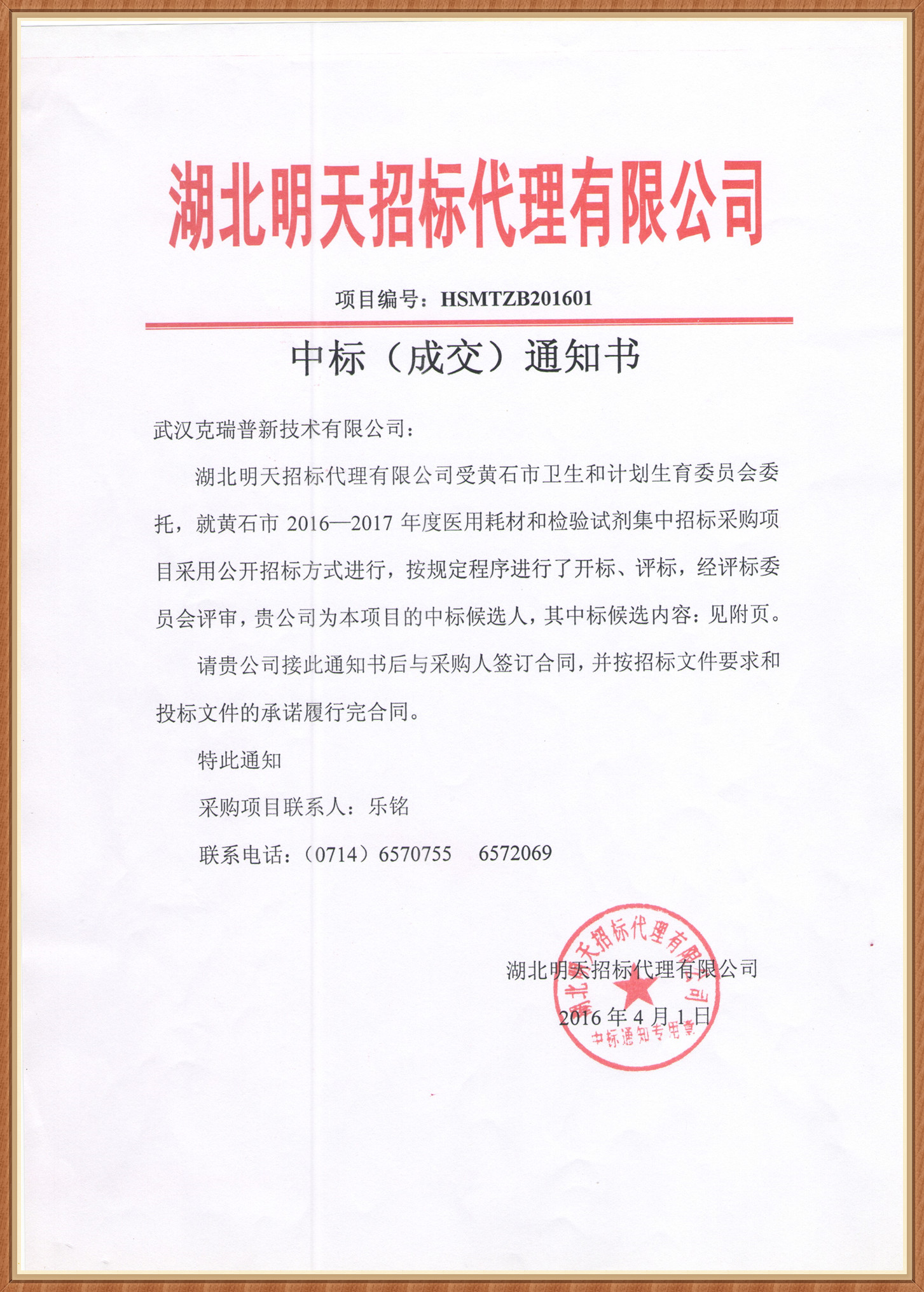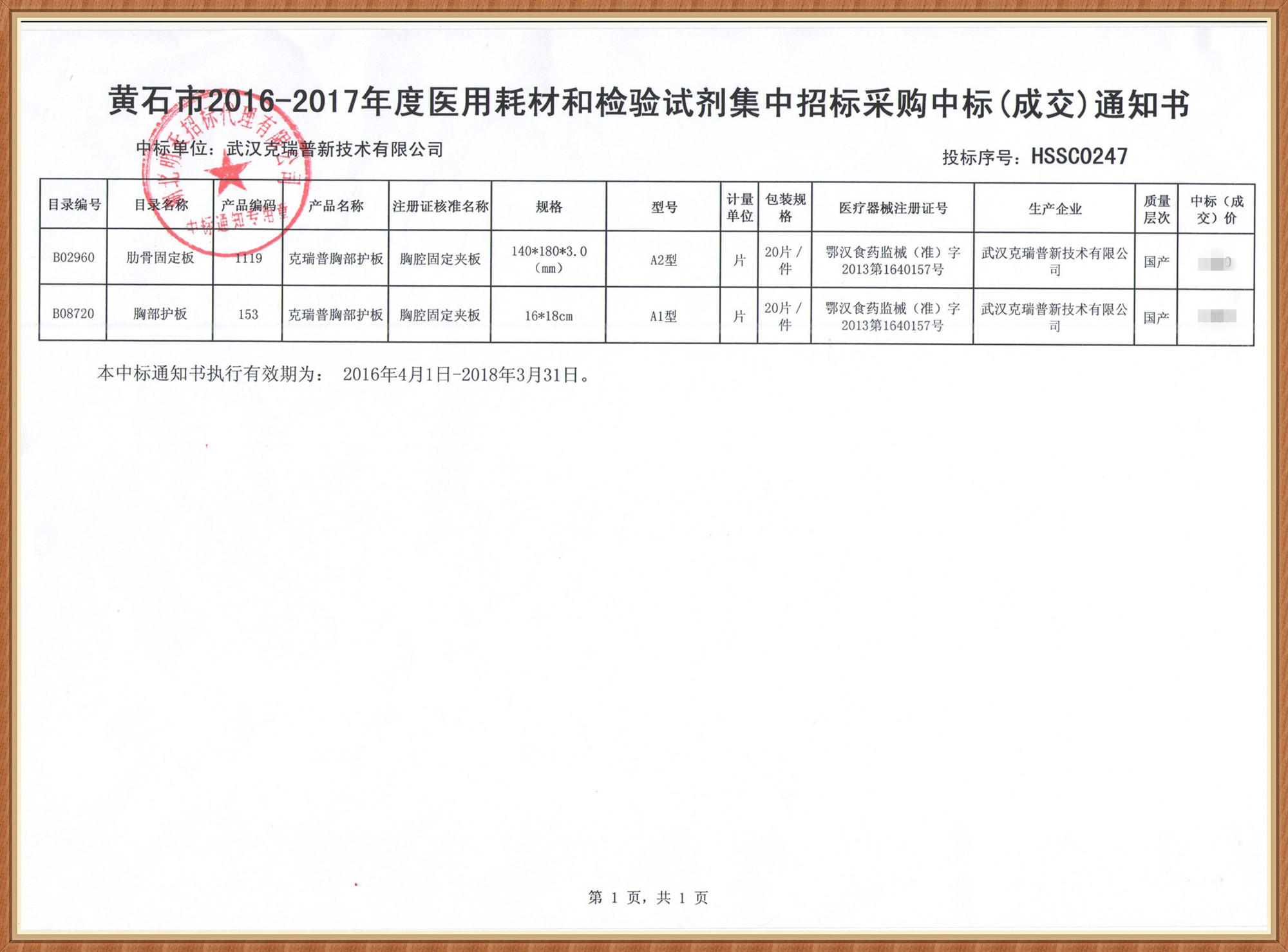 【湖北省黃石市醫(yī)用耗材和檢驗(yàn)試劑集中招標(biāo)采購中標(biāo)通知書】武漢克瑞普新技術(shù)有限公司在黃石市2016-2017年度醫(yī)用耗材和實(shí)驗(yàn)試劑集中招標(biāo)采購項(xiàng)目中按程序進(jìn)行評(píng)標(biāo)以及評(píng)標(biāo)委員會(huì)的評(píng)定已成功中標(biāo),我們?cè)诒敬尾少徶袠?biāo)了肋骨固定板(規(guī)格:140*180*3.0 型號(hào):A2型)以及胸部護(hù)板(規(guī)格:16*18 型號(hào):A1型)兩種骨科耗材產(chǎn)品。