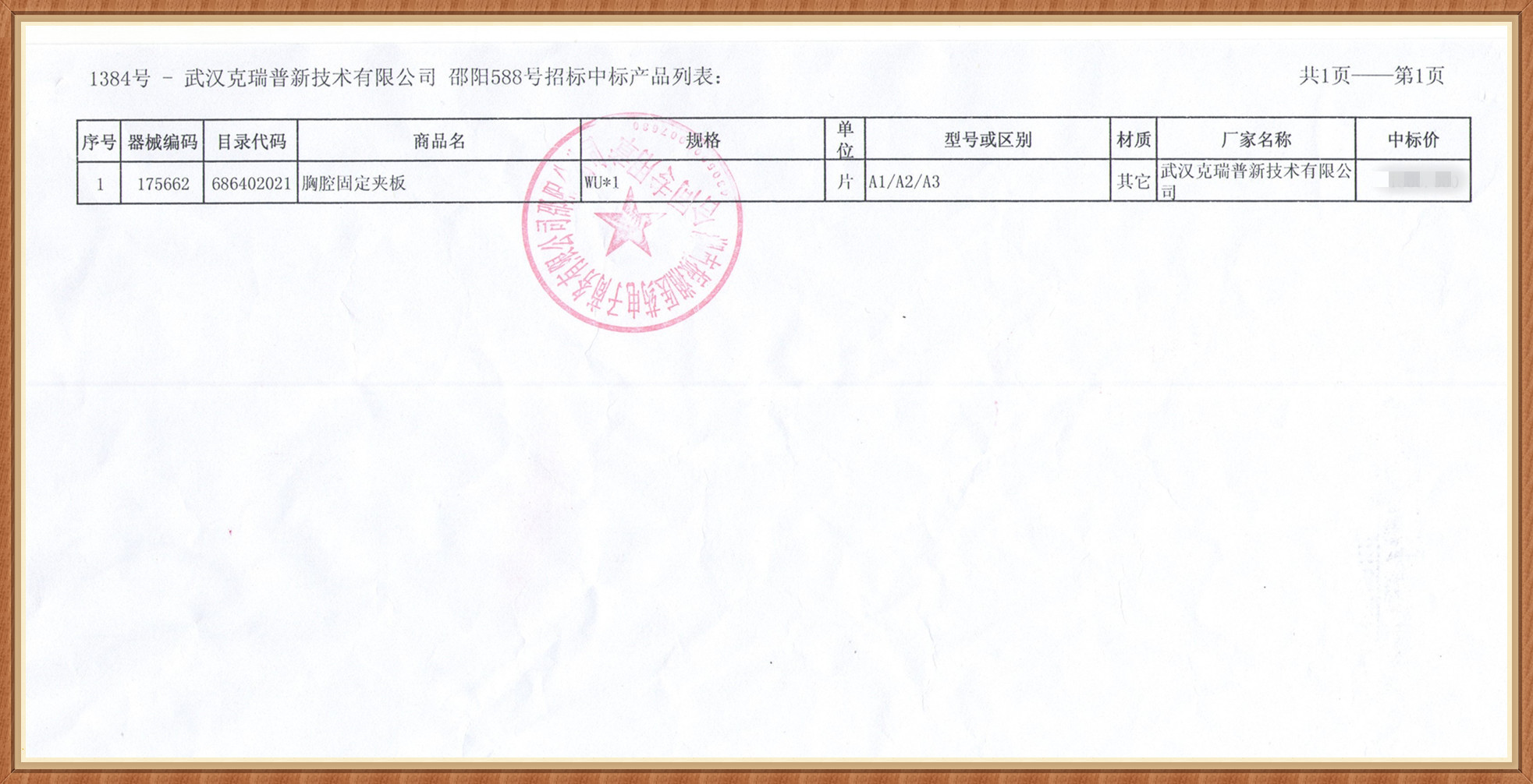 【湖南省邵陽市588號招標(biāo)】我們武漢克瑞普新技術(shù)有限公司的胸前固定夾板產(chǎn)品已經(jīng)在湖南省邵陽市588號招投標(biāo)中成功中標(biāo)產(chǎn)品展示,我們這次中標(biāo)的胸腔固定夾板產(chǎn)品型號分為A1/A2/A3三種型號,此產(chǎn)品已在多家醫(yī)院和診所采取了臨床使用,產(chǎn)品反應(yīng)良好歡迎其他的醫(yī)院以及經(jīng)銷商等來采購。