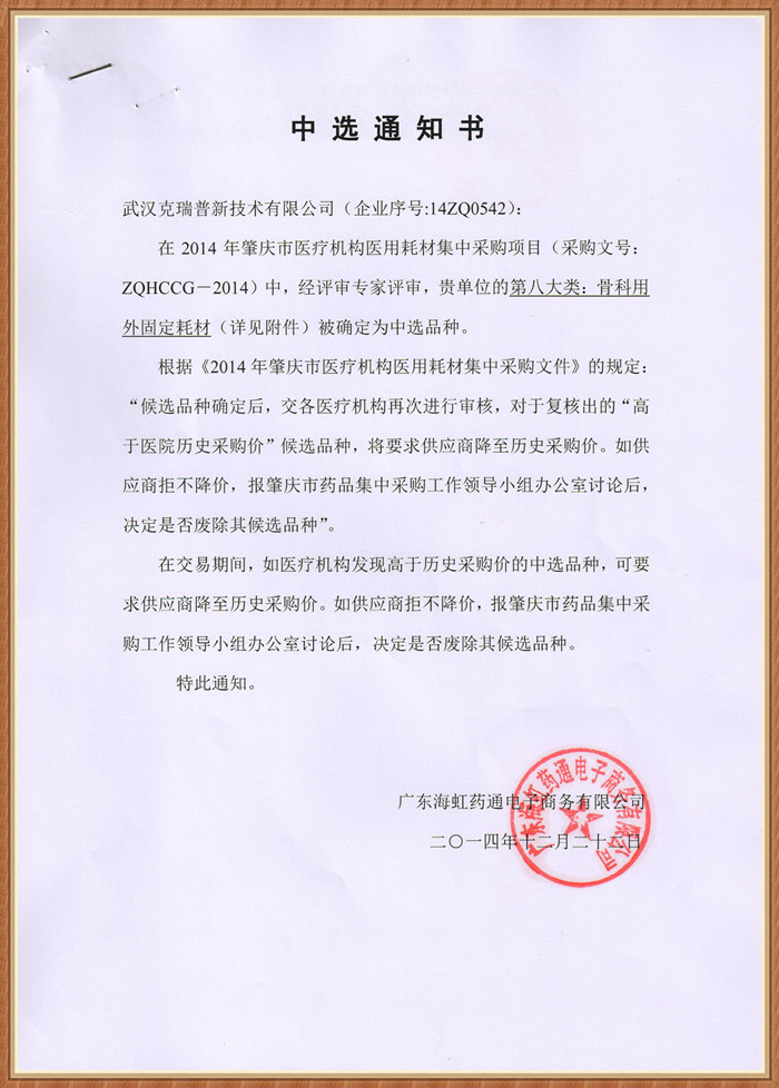 【廣東省2014年肇慶市醫(yī)療機(jī)構(gòu)醫(yī)用耗材集中采購項目中標(biāo)通知書】武漢克瑞普新技術(shù)有限公司(采購文號:ZQHCCG-2014)中我們公司生產(chǎn)的骨科用外固定耗材產(chǎn)品已成功中標(biāo),我們的骨科耗材產(chǎn)品種類較多,全部為一類的骨科耗材產(chǎn)品歡迎各大經(jīng)銷商與我們?nèi)〉寐?lián)系。