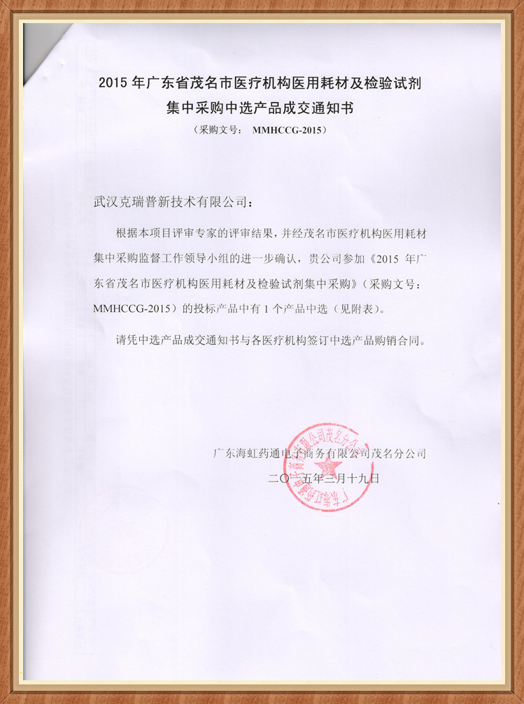 【2015年廣東省茂名市醫(yī)療機(jī)構(gòu)醫(yī)用耗材及檢驗(yàn)試劑集中采購中選產(chǎn)品成交通知書】我們武漢克瑞普公司生產(chǎn)的胸腔固定夾板產(chǎn)品在茂名市醫(yī)用耗材集中采購?fù)稑?biāo)中成功的成為了中標(biāo)產(chǎn)品,我們的胸腔固定夾板已在各大醫(yī)院臨床使用,使用反應(yīng)良好值得推薦。