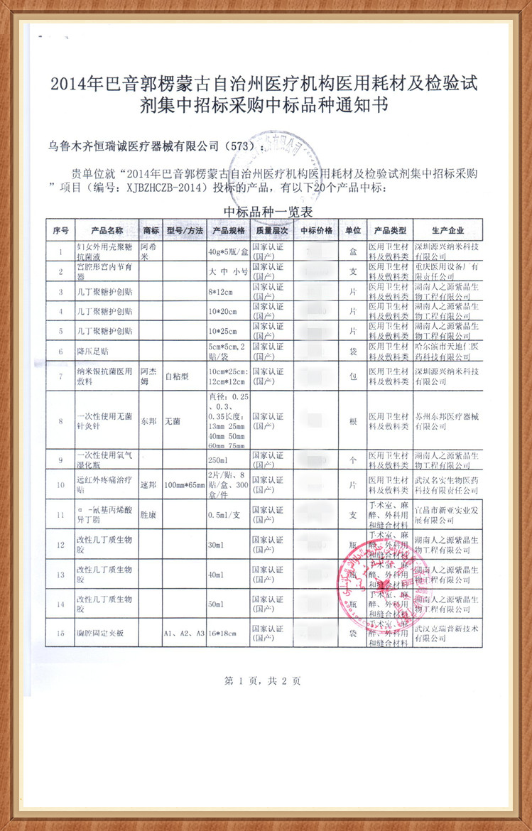 【2014年巴音郭楞蒙古自治州醫(yī)療機(jī)構(gòu)醫(yī)用耗材及檢驗(yàn)試劑集中招標(biāo)采購中標(biāo)品種通知書】我們武漢克瑞普公司在2014年蒙古自治州醫(yī)用耗材招標(biāo)采購項(xiàng)目中我們的胸腔固定夾板(A1、A2、A3)型脫穎而出成功成為了中標(biāo)產(chǎn)品。