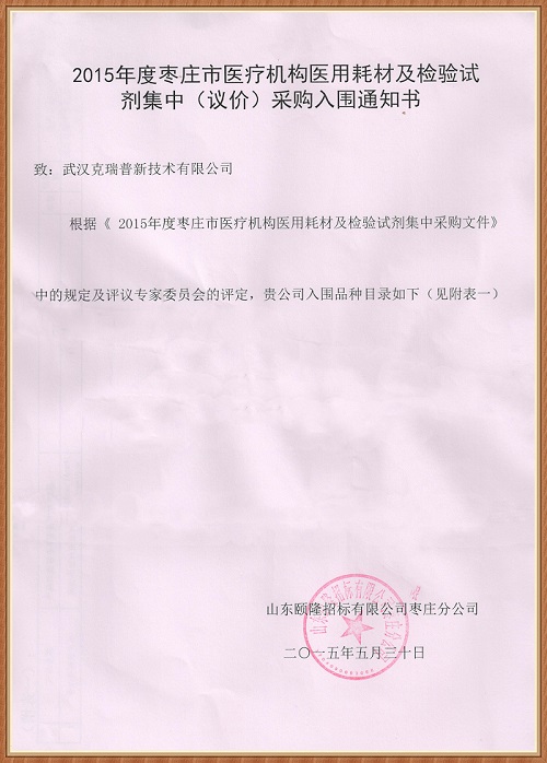 【山東省2015年度棗莊市醫(yī)療機(jī)構(gòu)醫(yī)用耗材及檢驗試劑集中(議價)采購入圍通知書】武漢克瑞普出品的胸腔固定夾板經(jīng)過委員會專家評定,我公司的產(chǎn)品成功中標(biāo)入圍,本次中標(biāo)產(chǎn)品數(shù)量較少我們的胸骨固定板是由高分子納米材料、記憶鋁合金板、多頭胸背部肋骨固定帶等組成,使用方便患者使用過程中不會感到有束縛感同時還可以緩解患者的呼吸。